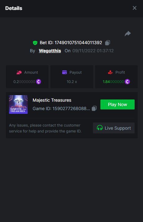 3. https://bc.game/#/sd/10YLHMO9FMMHW3 https://bc.game/#/sd/10YLI16E0IO0LV https://bc.game/#/sd/10YLIEX5ZDW9OZ I don't know why the bet ID shows 1 cent less per bet, while it's 10 cents on the provider's page. This would have made me eligible for bounty with exactly 50x. Look at screenshot below for example. https://bc.game/#/sd/10YLIV09L2KW7N https://bc.game/#/sd/10YLJADSJL3L77 https://bc.game/#/sd/10YLJI9Y61ZCIB https://bc.game/#/sd/10YLJVIP8441ZN https://bc.game/#/sd/10YLK4I9DYJAJ7